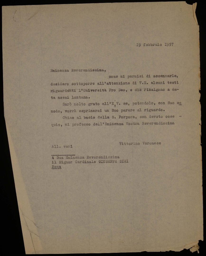 Lettera di Vittorino Veronese al cardinale Giuseppe Siri
