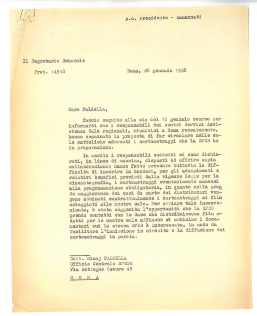 Lettera di Silvano Battisti, segretario generale dell'ACEC, a Minaj Faldella, responsabile dell'ufficio centrale Studi, propaganda e stampa - SPES della DC