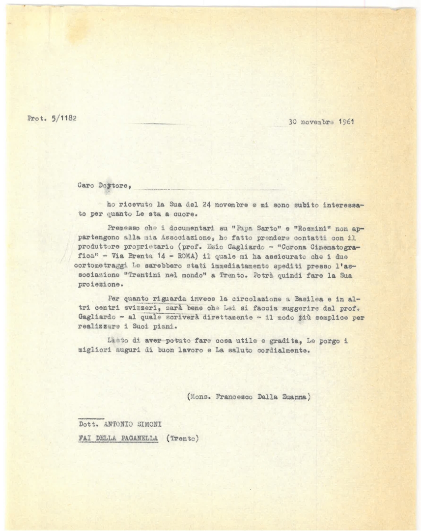 Lettera di mons. Francesco Dalla Zuanna, presidente dell'ACEC, a Antonio Simoni, giornalista del periodico "Trentini nel mondo"