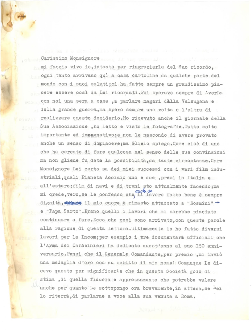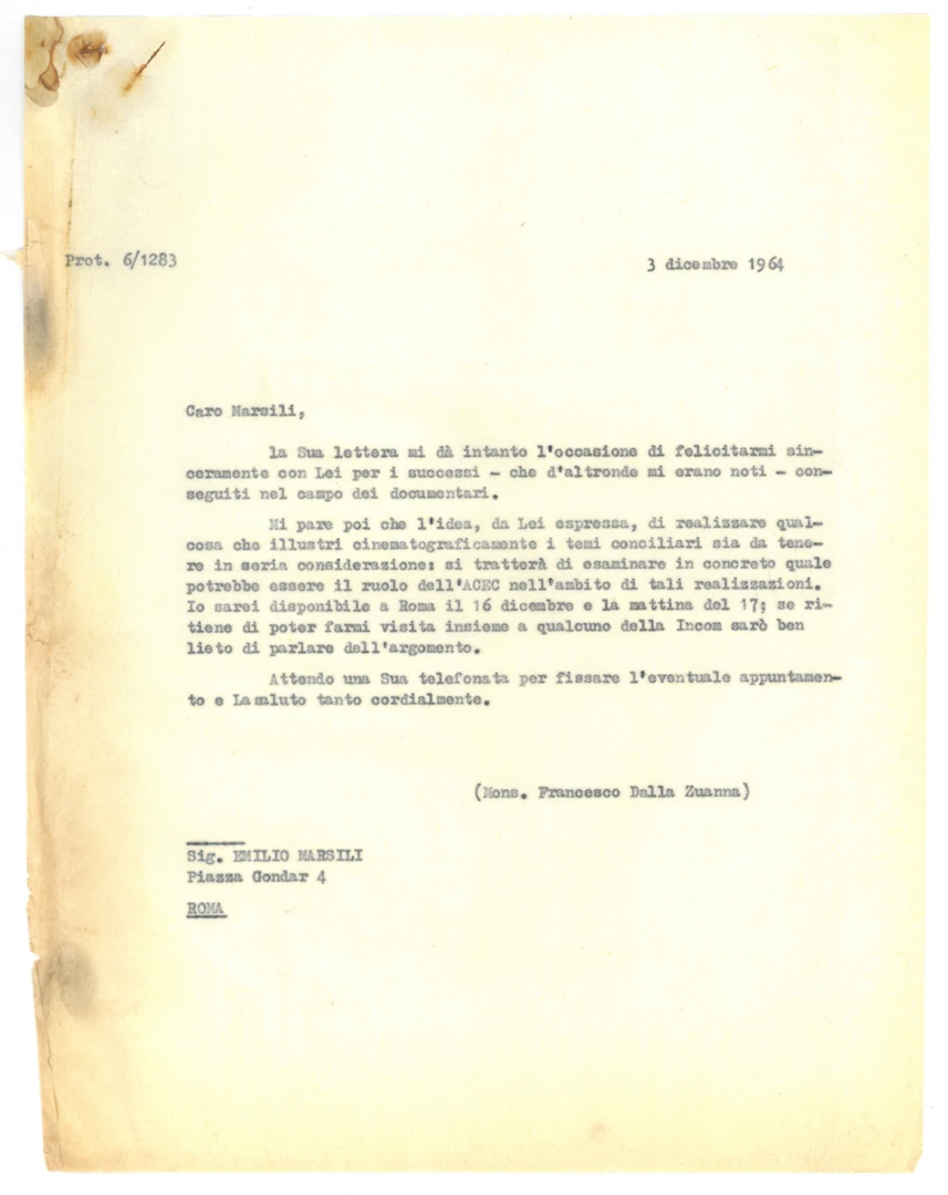 Lettera di Emilio Marsili, regista, scrittore e sceneggiatore, a mons. Francesco Dalla Zuanna, presidente dell'ACEC
