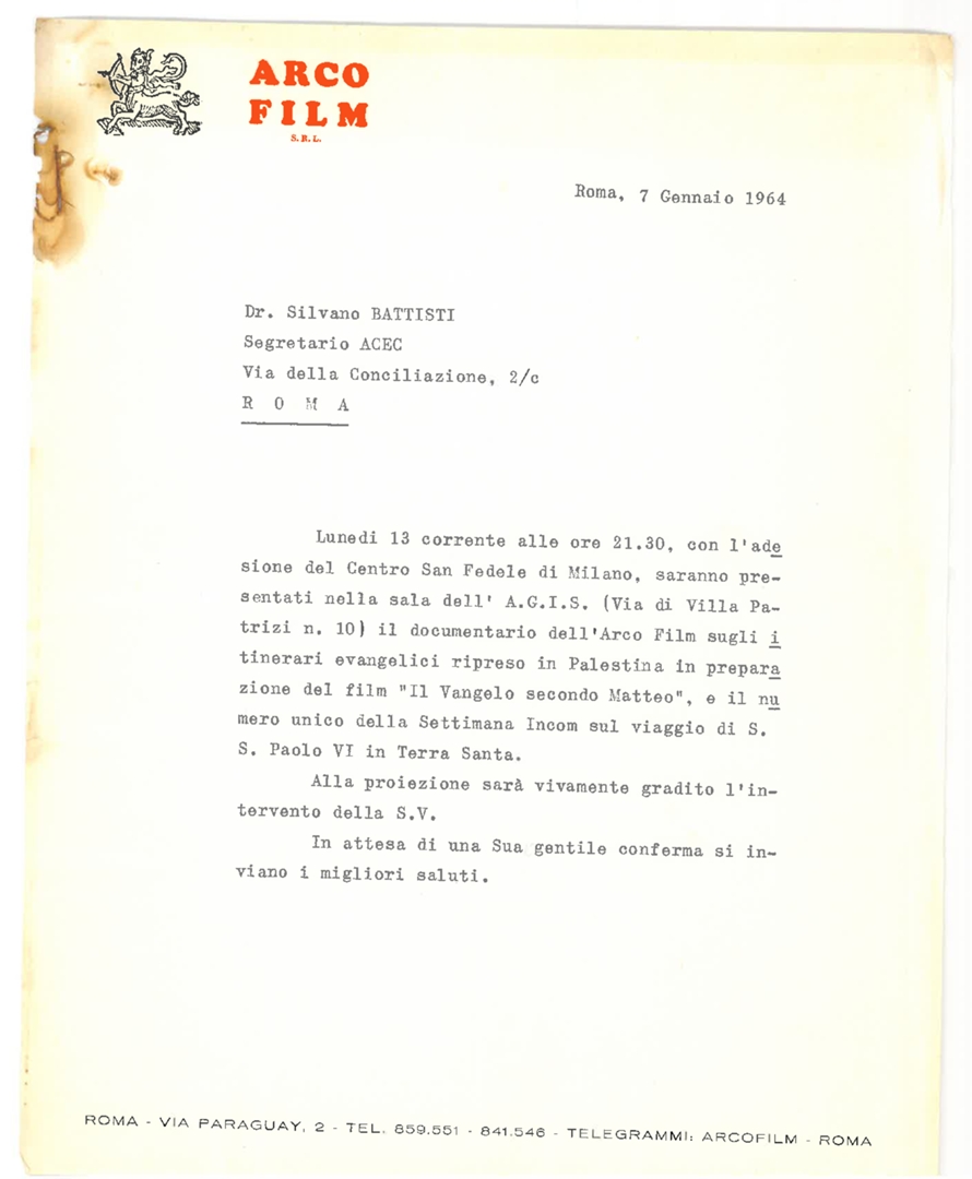 Invito della Arco Film srl indirizzato a Silvano Battisti, segretario generale dell'ACEC