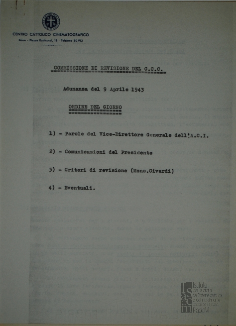 "Commissione di revisione del Centro cattolico cinematografico - CCC. Adunanza del 9 aprile 1943"