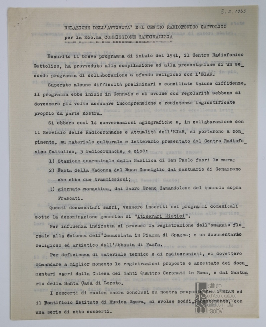 "Relazione dell'attività del Centro radiofonico cattolico per l'ecc.ma Commissione cardinalizia", a cura di Enrico Basari, segretario del Centro radiofonico cattolico - CRC
