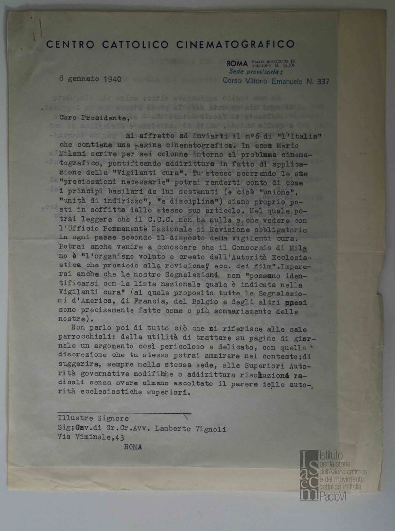 Lettera non firmata indirizzata a Lamberto Vignoli, presidente del Centro cattolico cinematografico - CCC