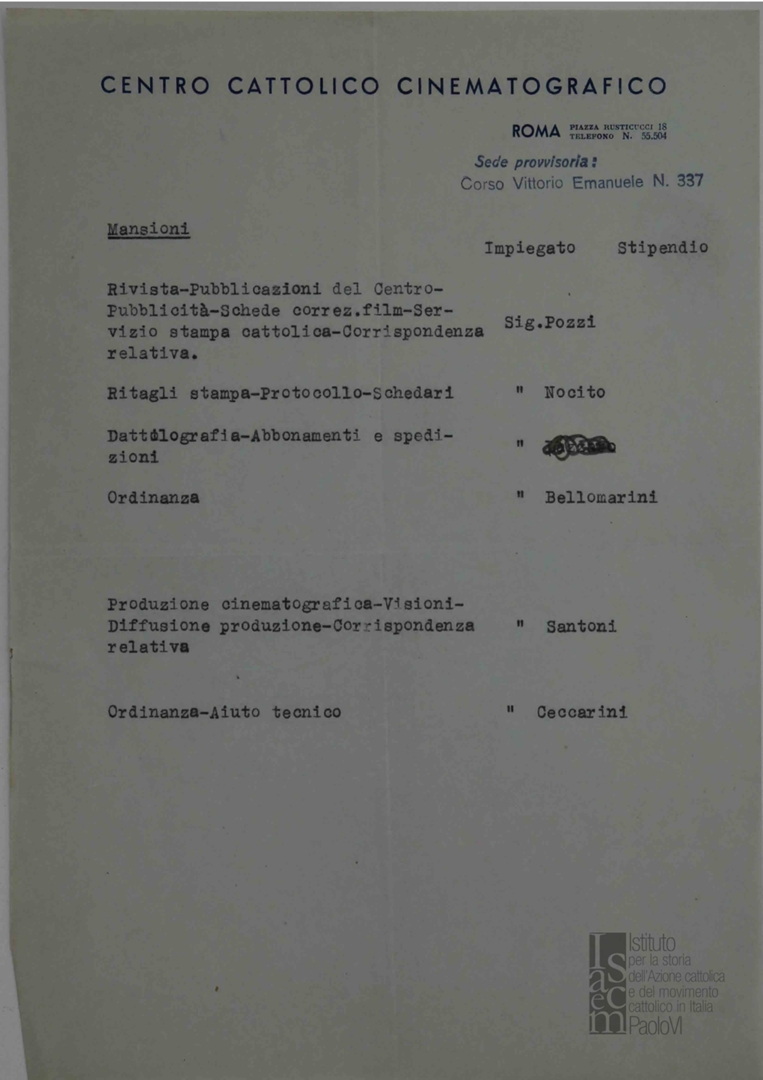 Personale in servizio presso il Centro cattolico cinematografico - CCC: mansioni e stipendi