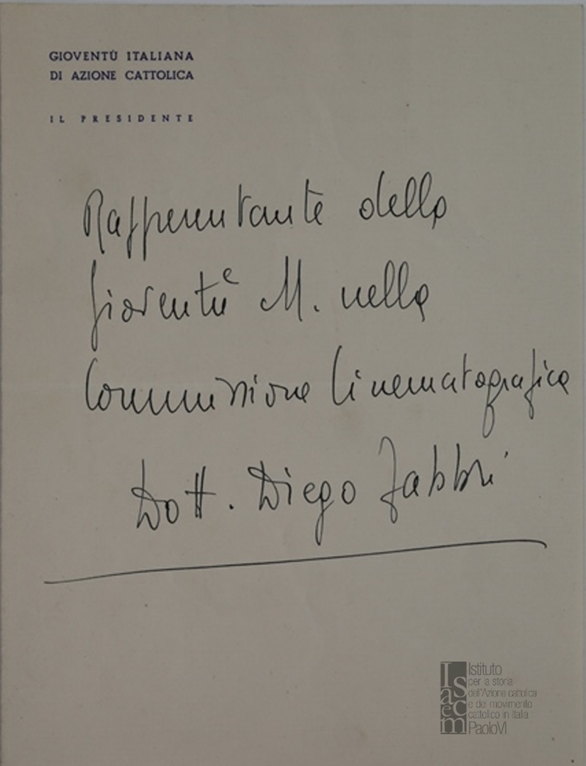 Indicazione di Diego Fabbri quale rappresentante della Gioventù Italiana di Azione Cattolica nella Commissione cinematografica