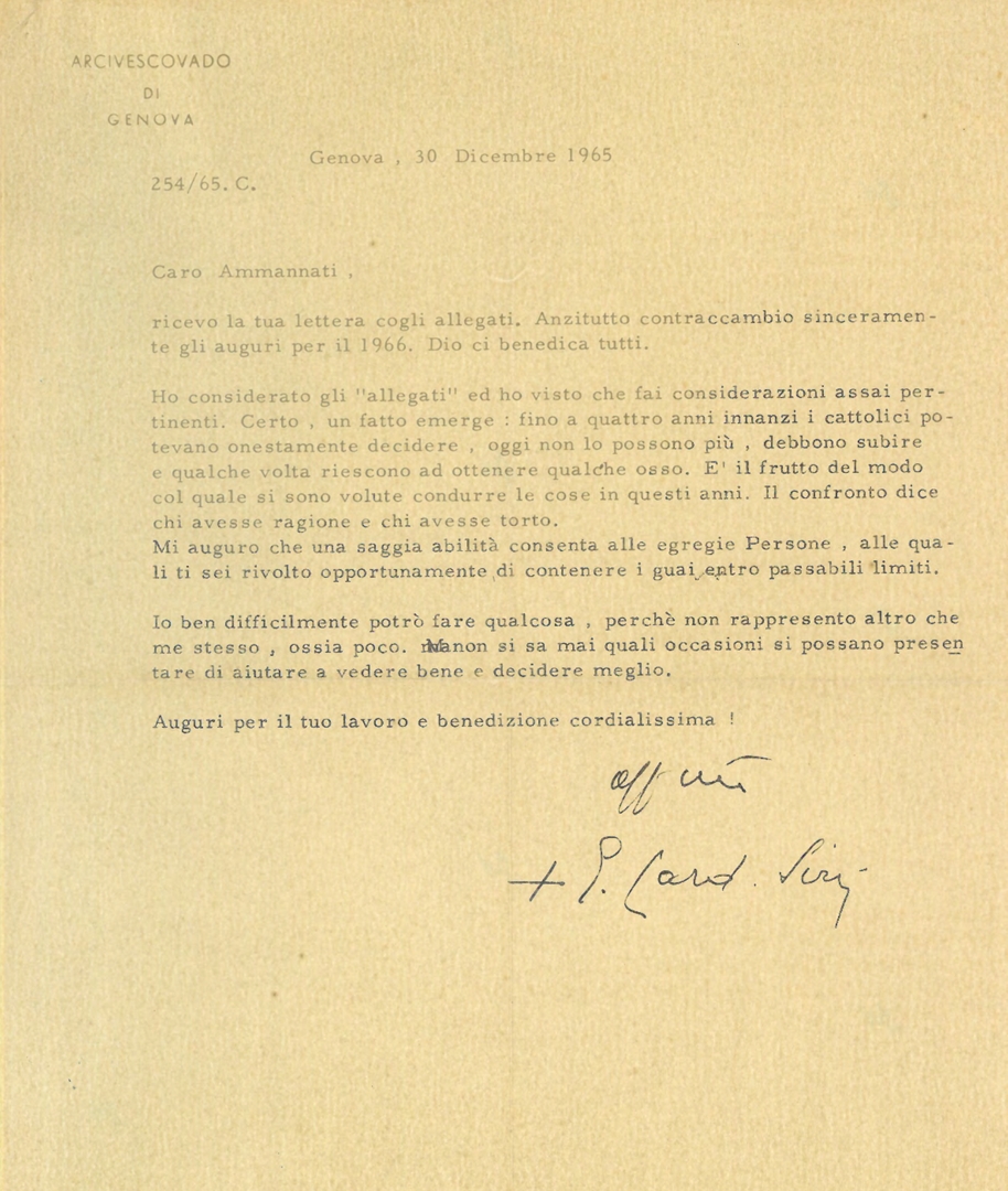 Lettera del sacerdote Giuseppe Siri dell'Arcivescovado di Genova a Floris Luigi Ammannati, vice presidente dell'ACEC