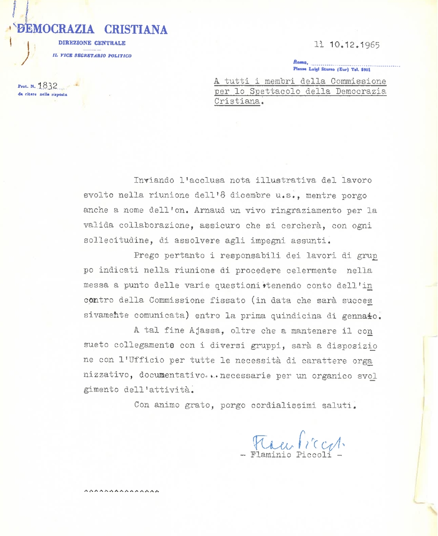 Lettera di risposta dell'on. Flaminio Piccoli, vice segretario politico della Democrazia cristiana, a Floris Luigi Ammannati, vice presidente dell'ACEC