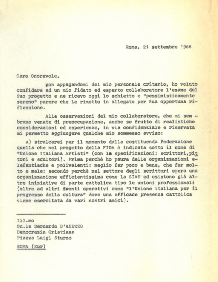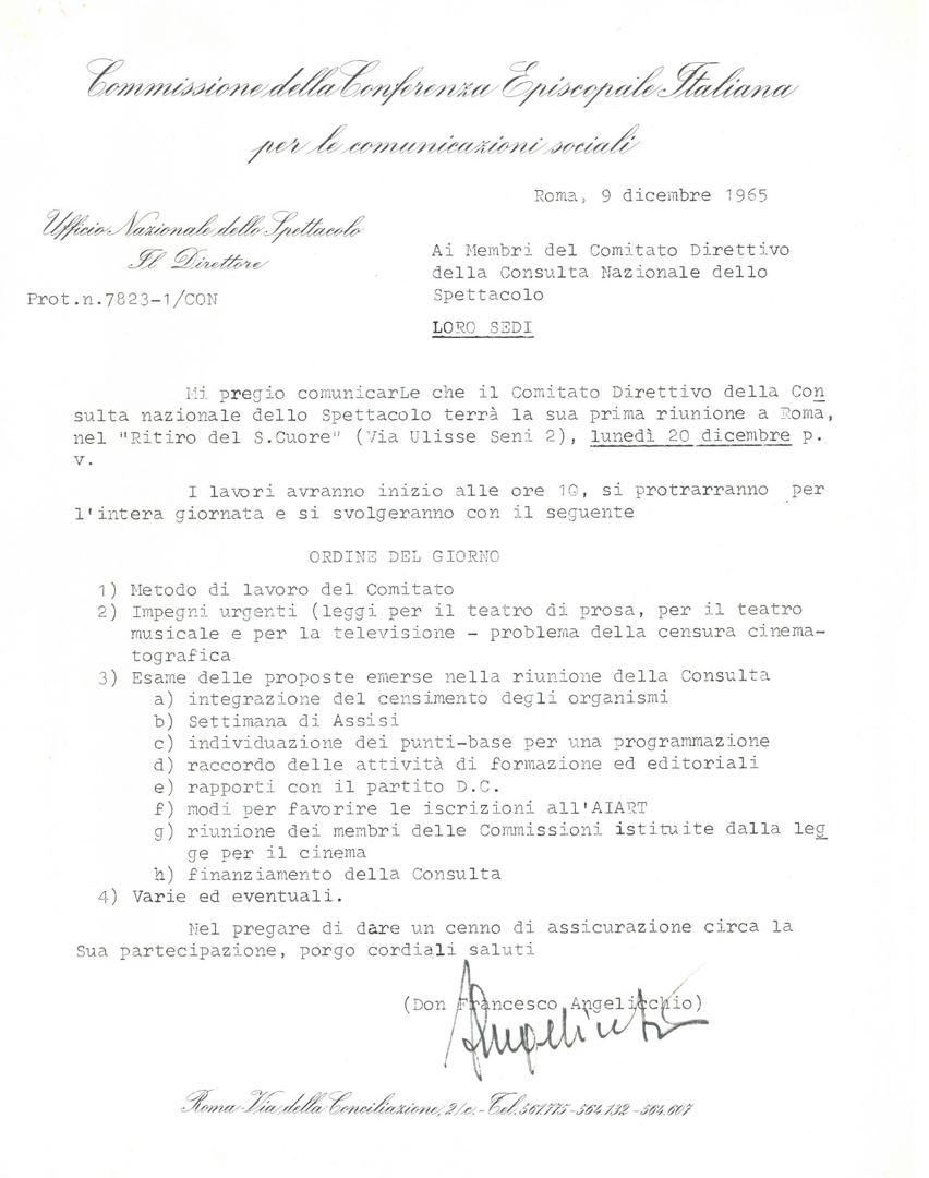 Lettera di don Francesco Angelicchio, direttore dell'Ufficio nazionale dello spettacolo, all'on. Bernardo D'Arezzo