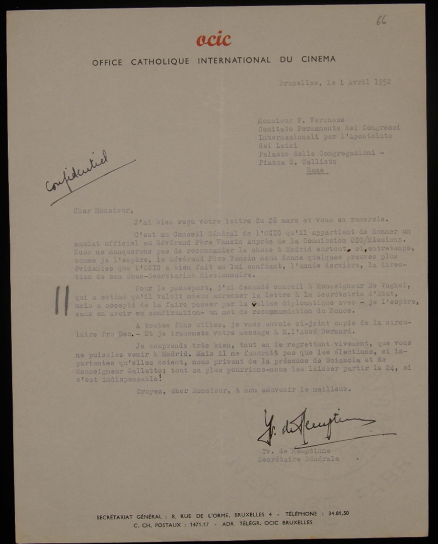 Lettera di Yvonne de Hemptinne, segretario generale dell'Office catholique international du cinematographe - OCIC, a Vittorino Veronese, presidente del Comitato permanente per i congressi internazionali dell'apostolato dei laici