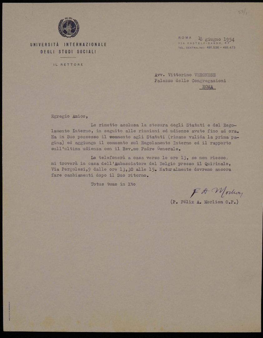 Lettera di padre Félix Morlion, rettore dell'Università internazionale di studi sociali, a mons. Giovanni Battista Montini, sostituto alla segreteria di Stato di Sua Santità