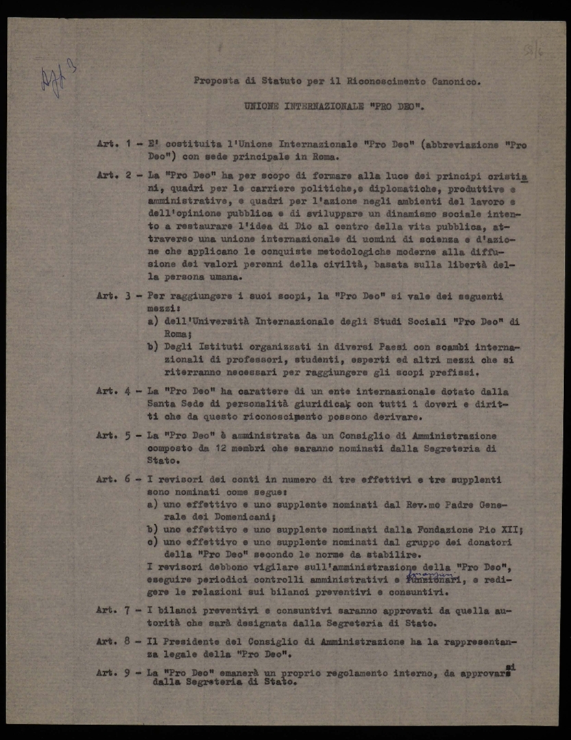 "Proposta di Statuto per il riconoscimento canonico. Unione Internazionale Pro Deo"