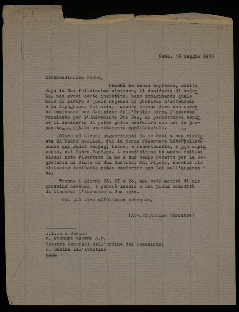 Lettera di Vittorino Veronese a padre Michele Browne, maestro generale dell'Ordine dei domenicani