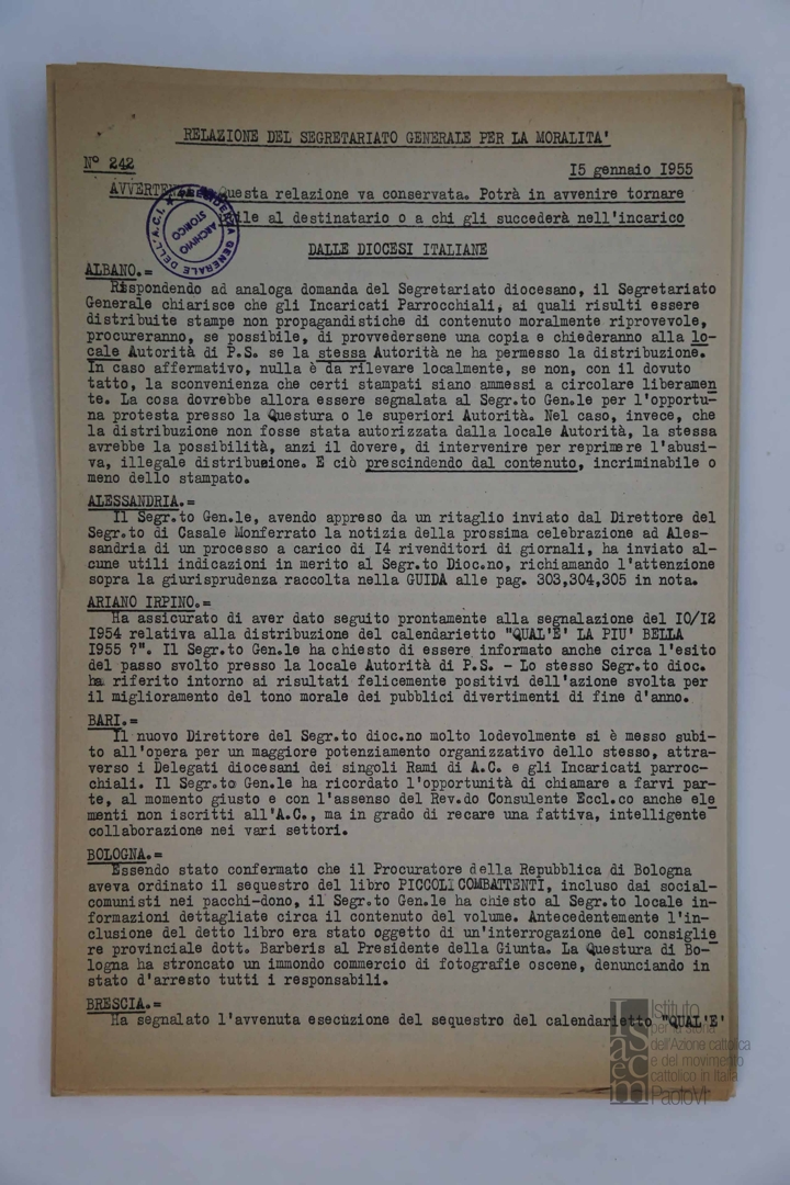 "Relazione del Segretariato Generale per la Moralità. Nr. 242"