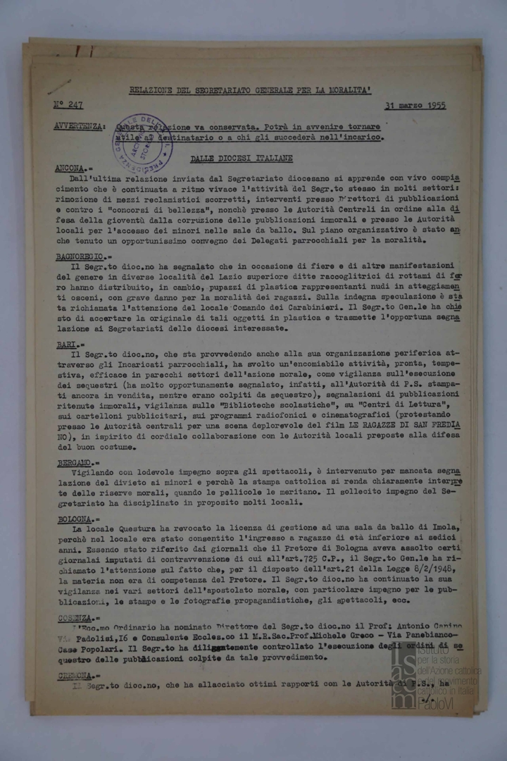 "Relazione del Segretariato Generale per la Moralità. Nr. 247"