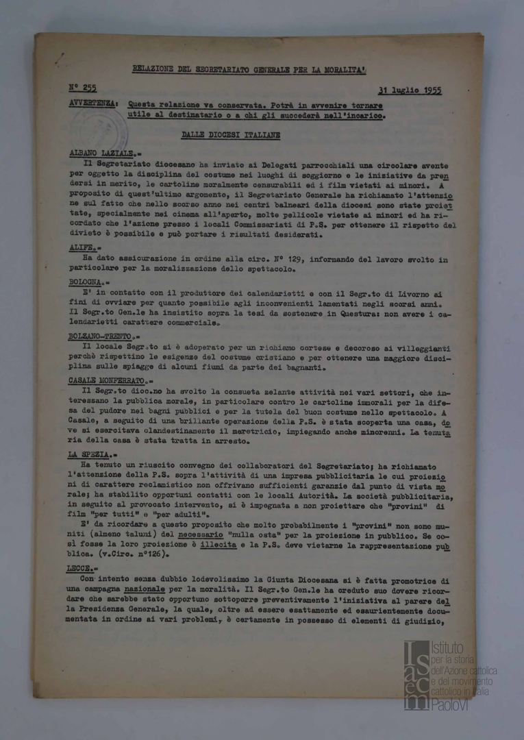 "Relazione del Segretariato Generale per la Moralità. Nr. 255"