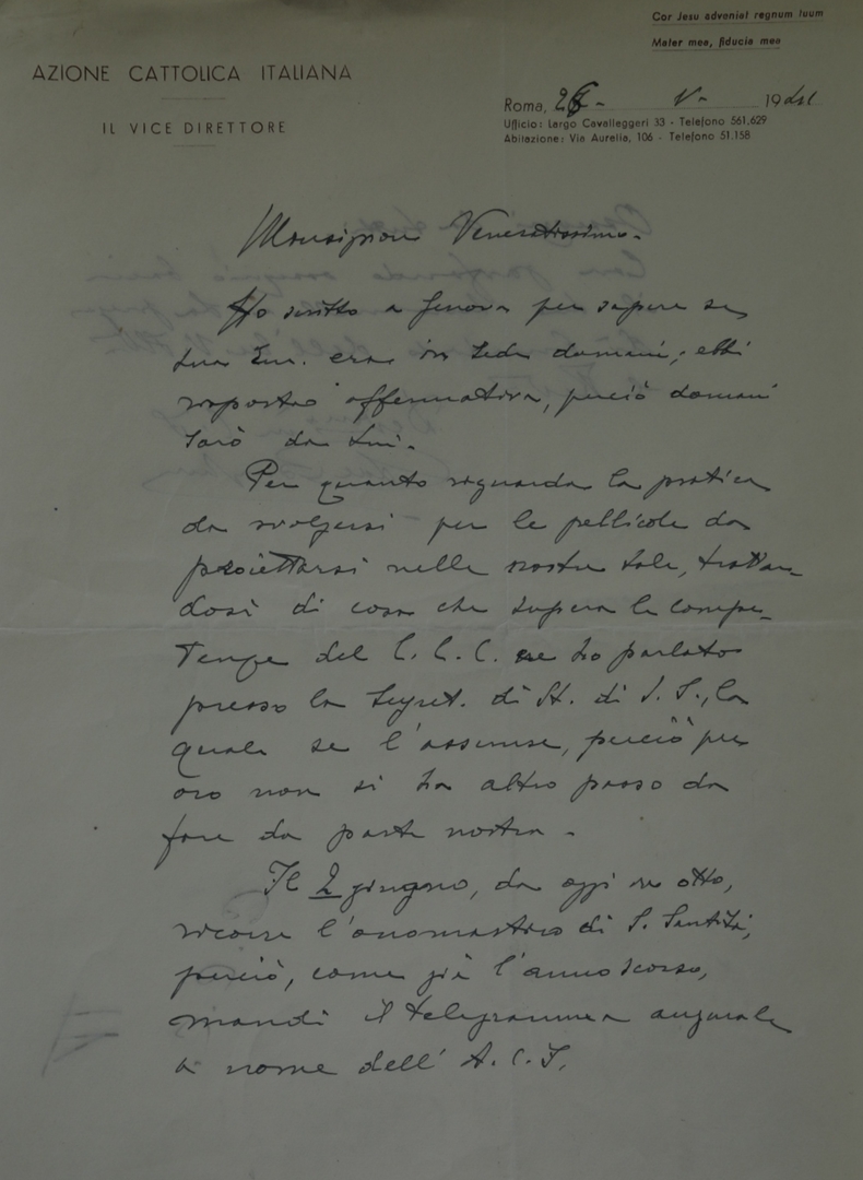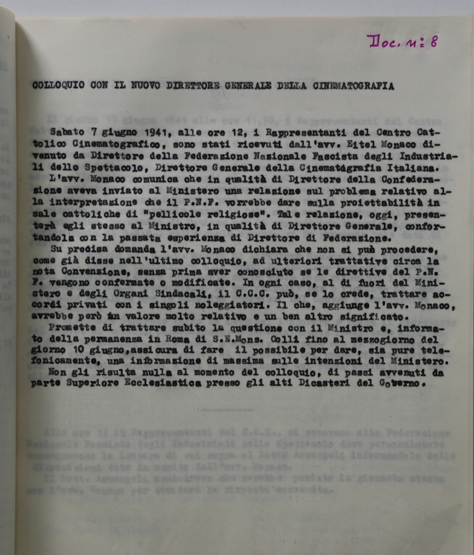 "Relazione sui primi contatti presi con la Federazione nazionale fascista degli industriali dello spettacolo in ottemperanza alle decisioni della Commissione cardinalizia", a cura di Paolo Salviucci, segretario del Centro cattolico cinematografico - CCC