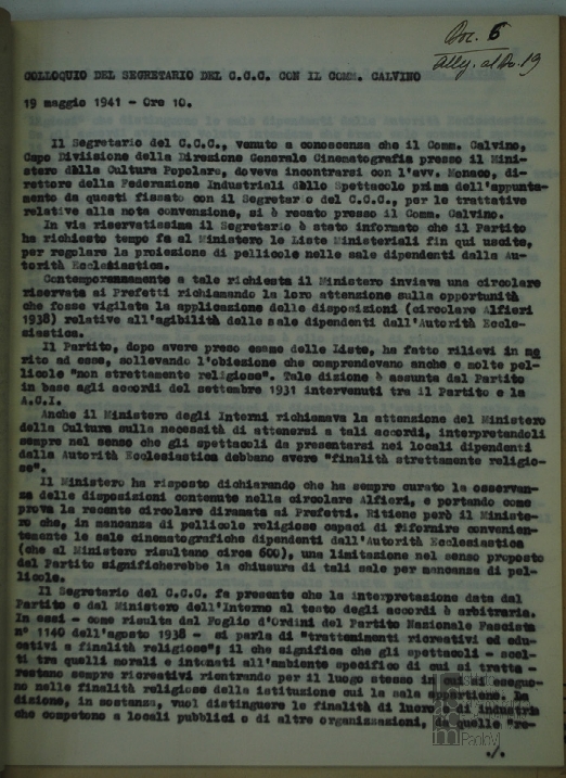 "Colloquio del segretario del C.C.C. con il comm. Calvino. 19 maggio 1941, ore 10"