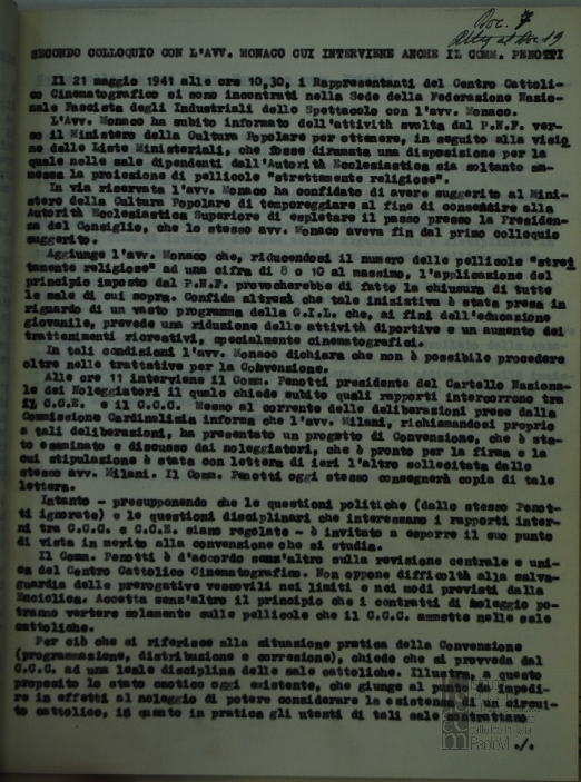 "Secondo colloquio con l'avv. Monaco cui interviene pure il comm. Penotti", a cura di Paolo Salviucci, segretario del Centro cattolico cinematografico - CCC