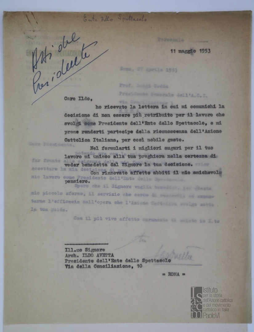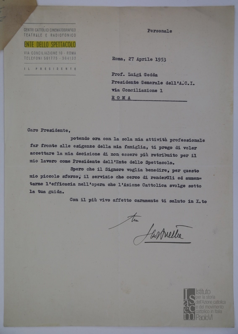 Lettera di Ildo Avetta, presidente dell'Ente dello spettacolo, a Luigi Gedda, presidente generale dell'ACI