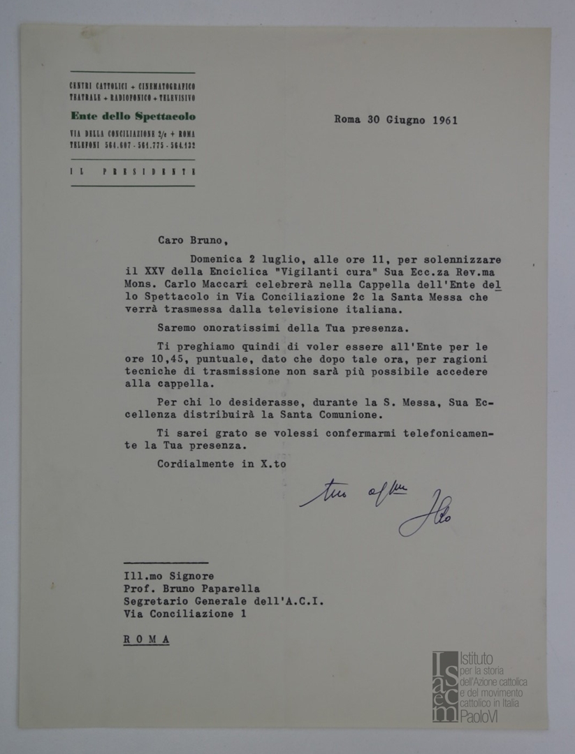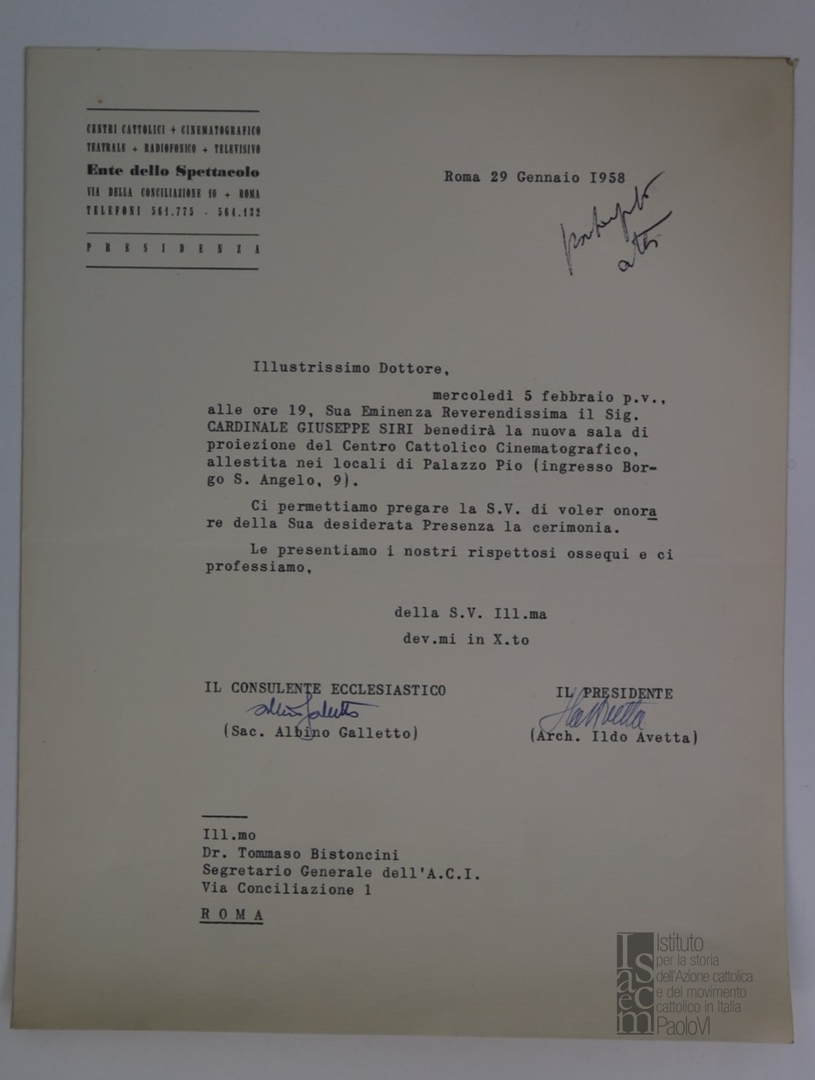 Lettera a firma di Ildo Avetta, presidente dell'Ente dello spettacolo, e di mons. Albino Galletto, consulente ecclesiastico dell'Ente dello spettacolo, a Tommaso Bistoncini, segretario generale dell'ACI