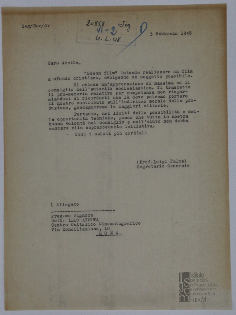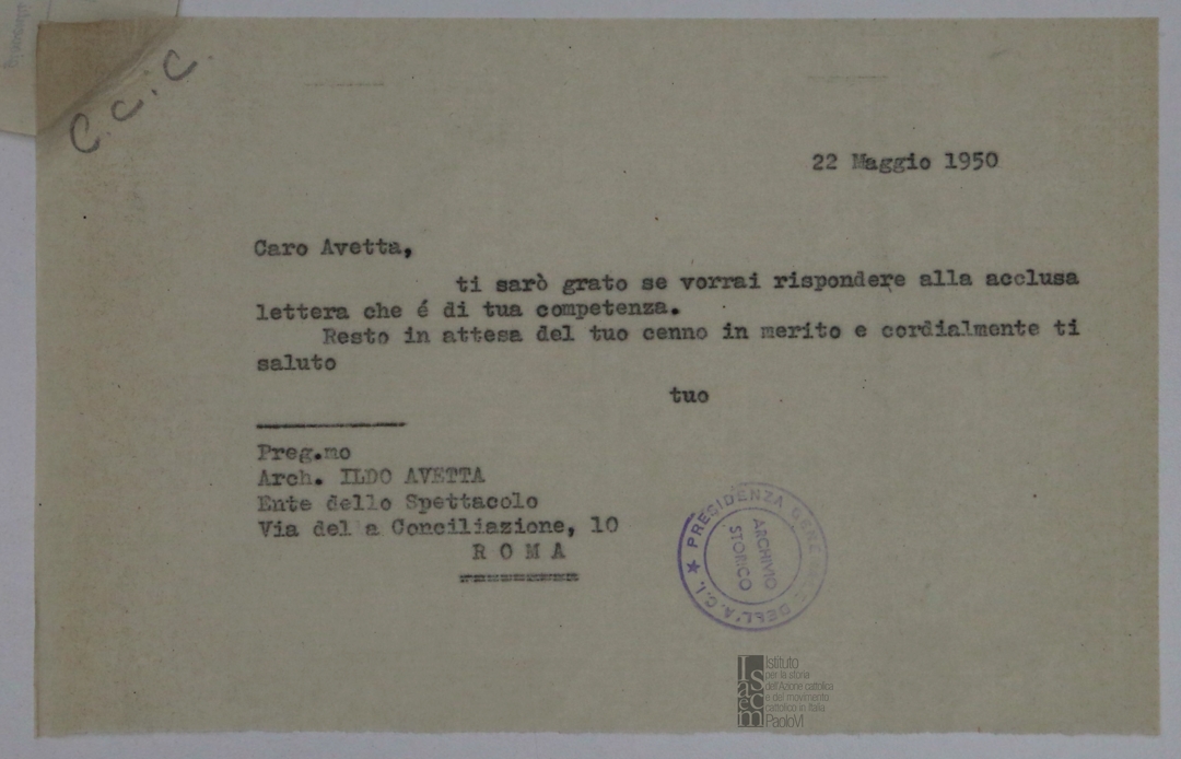Lettera di Luigi Palma, segretario generale del Centro nazionale di Azione Cattolica di Roma, a Ildo Avetta, presidente dell'Ente dello spettacolo
