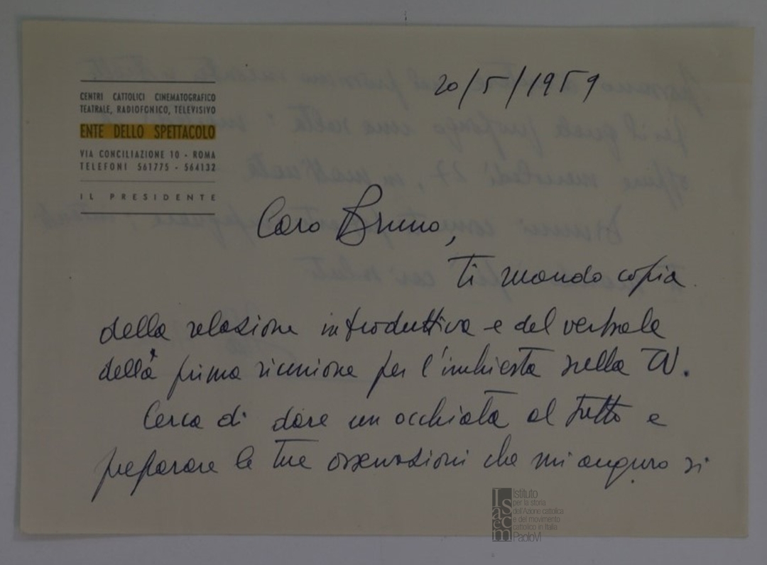 Lettera di Ildo Avetta, segretario del Centro cattolico cinematografico - CCC, a Bruno [...]