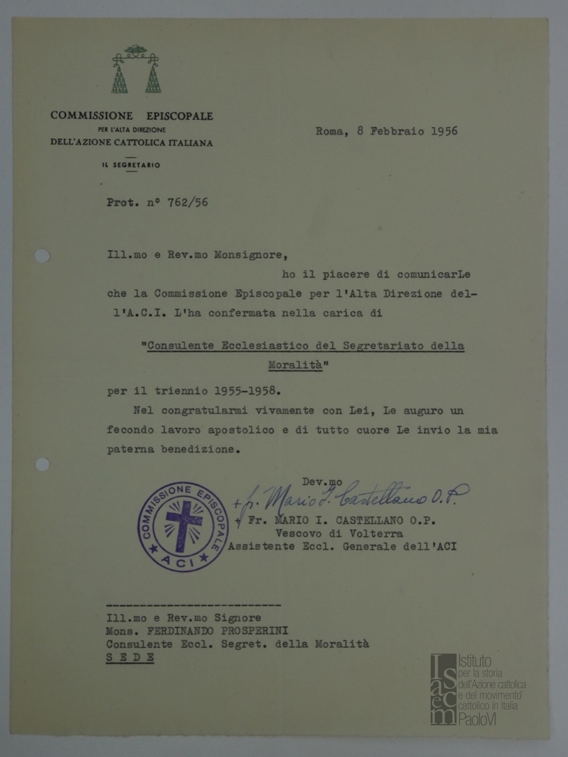 Lettera di mons. Ferdinando Prosperini, consulente ecclesiastico del Segretariato della moralità, a mons. Mario J. Castellano, vescovo di Volterra e assistente ecclesiastico generale dell'ACI