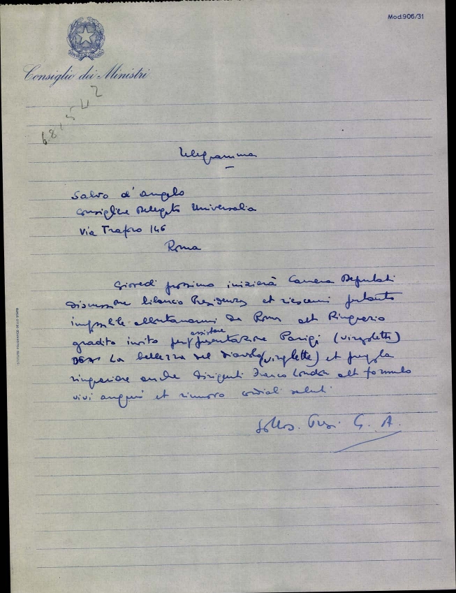 Telegramma di Giulio Andreotti, sottosegretario alla presidenza del consiglio, a Salvo D'Angelo, consigliere delegato di Universalia