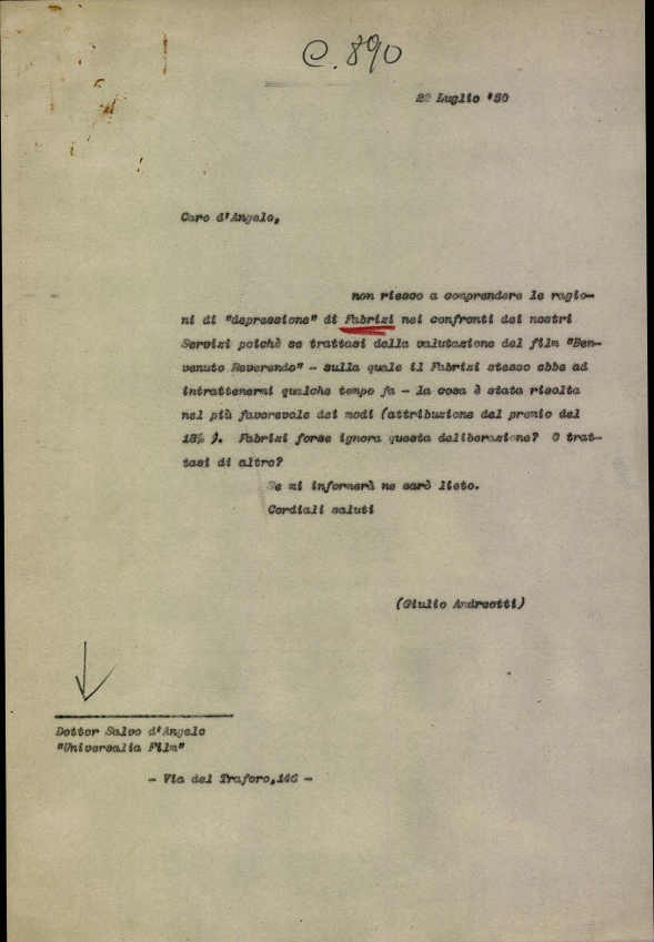 Lettera di Salvo D'Angelo, direttore della Universalia Film, all'on. Giulio Andreotti, sottosegretario di Stato alla presidenza del consiglio dei ministri