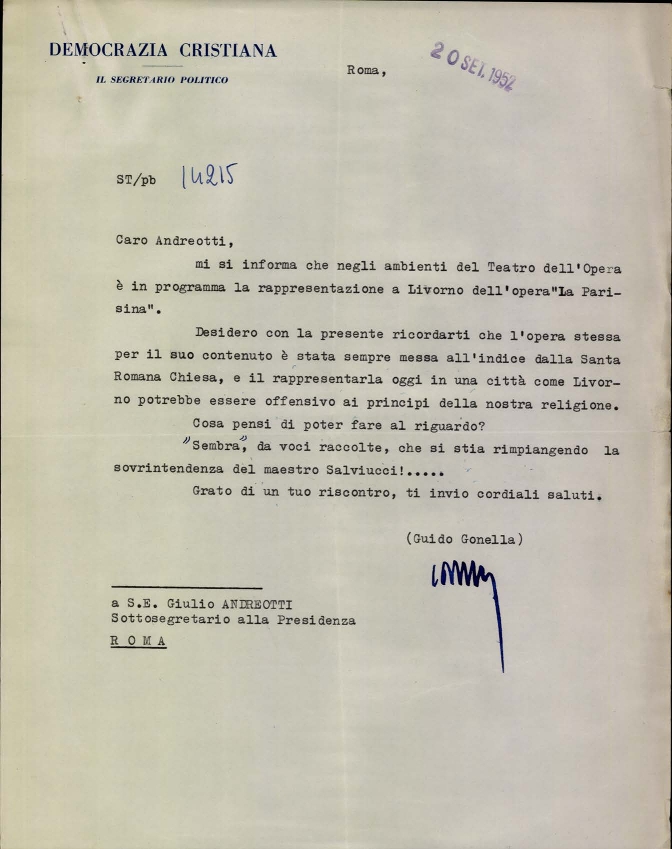 Lettera dell'on. Guido Gonella, segretario politico della Democrazia cristiana, all'on. Giulio Andreotti, sottosegretario di Stato alla Presidenza del consiglio
