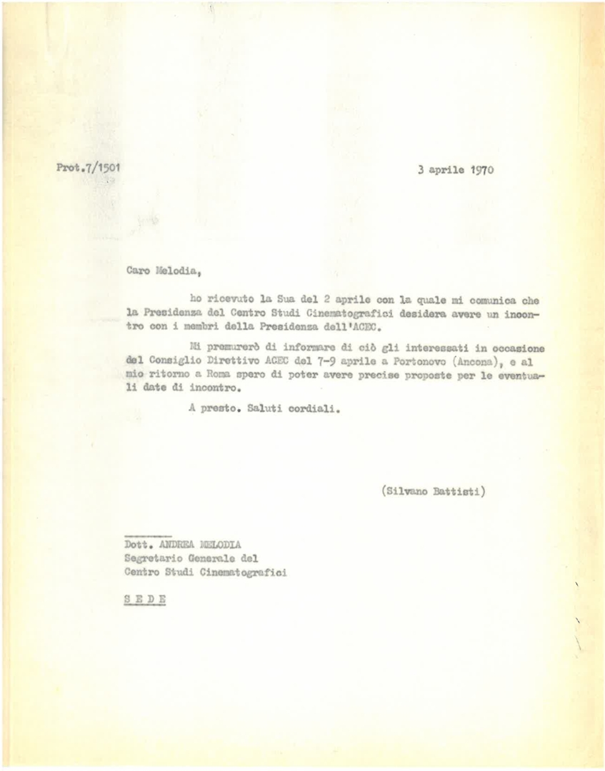 Lettera di Silvano Battisti, segretario generale dell'ACEC, ad Andrea Melodia, segretario generale del Centro studi cinematografici - CSC