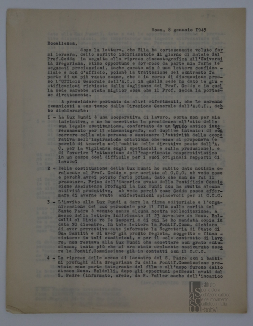 Lettera di p. Vincenzo Gilla Gremigni, direttore generale dell'ACI, a Giovanni Battista Montini, sostituto Segreteria di Stato della Santa Sede