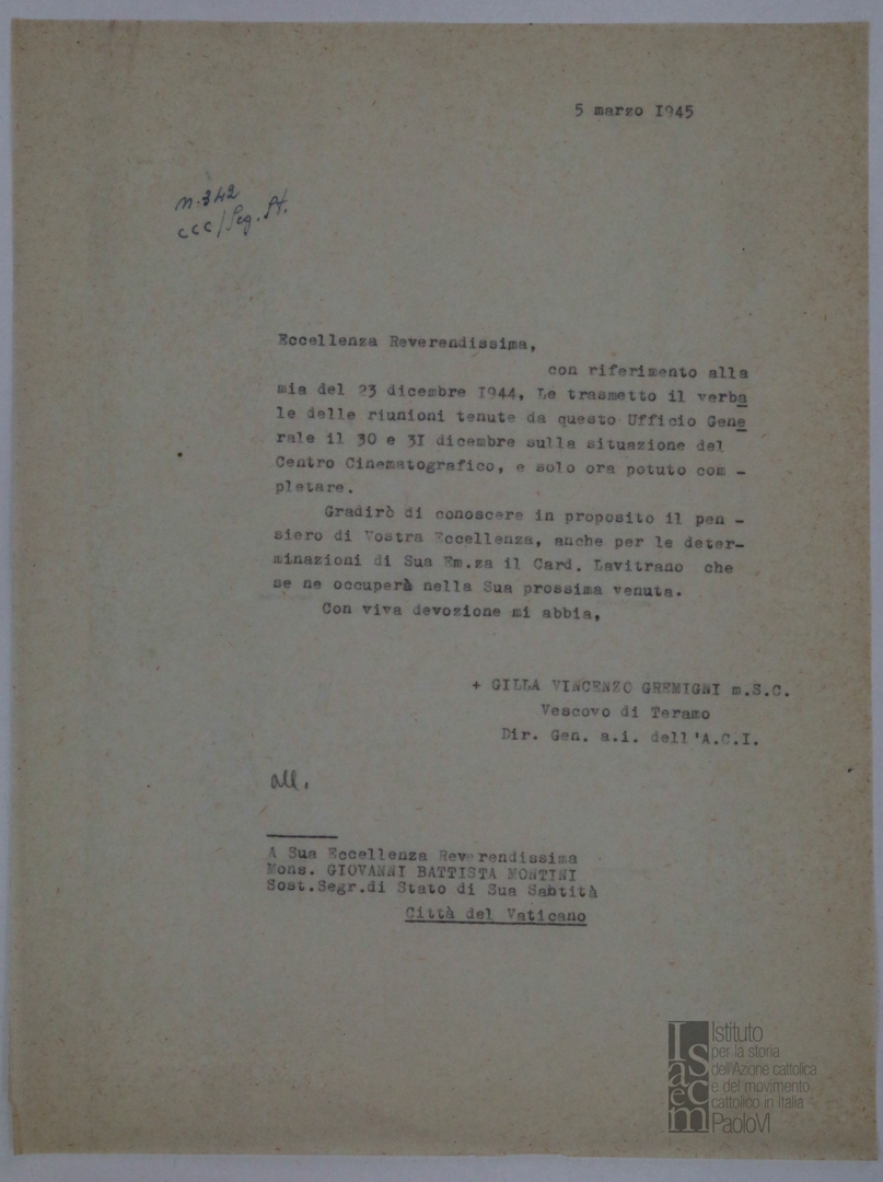 Lettera di Giovanni Battista Montini della Segreteria di stato di Sua Santità, a Lamberto Vignoli, presidente del Centro cattolico cinematografico - CCC