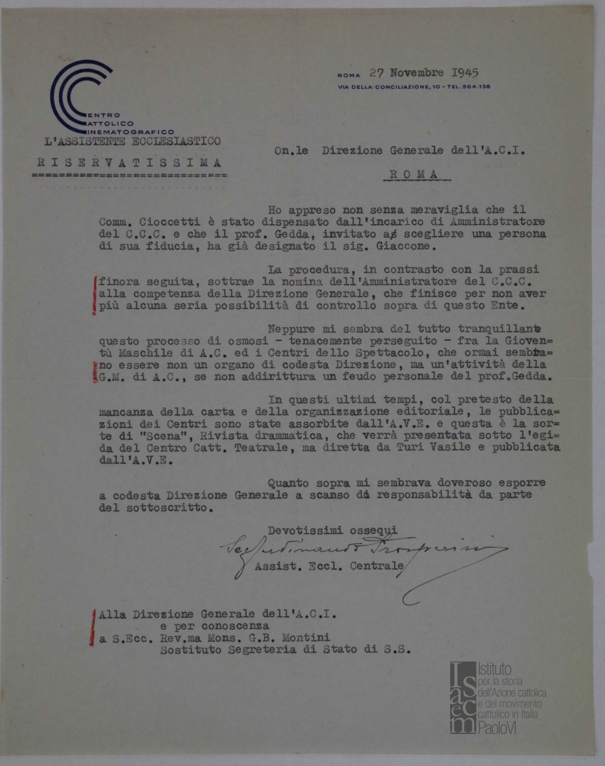 Lettera di mons. Ferdinando Prosperini, consulente ecclesiastico dell'Ente dello spettacolo, alla Direzione generale dell'ACI e per conoscenza a mons. Giovanni Battista Montini, sostituto alla segreteria di Stato di Sua Santità
