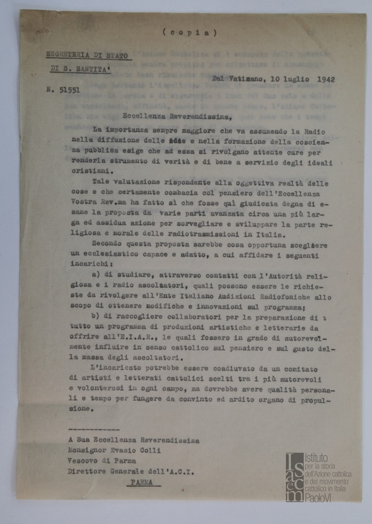 Lettera di mons. Giovanni Battista Montini, sostituto alla segreteria di Stato di Sua Santità, a mons. Evasio Colli, vescovo di Parma e direttore generale dell'ACI
