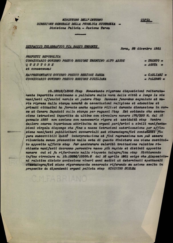 Dispaccio telegrafico dell'on. Mario Scelba, ministro degli interni, ai prefetti della Repubblica, al commissario del governo presso la regione Trentino Alto Adige e al questore