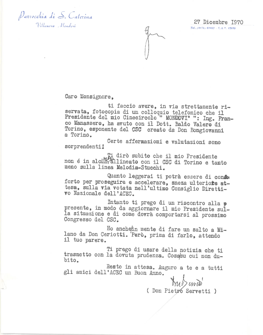 Lettera di don Pietro Servetti della parrocchia di Santa Caterina di Villanova Mondovì a mons. Luigi PIgnatiello, presidente dell'ACEC
