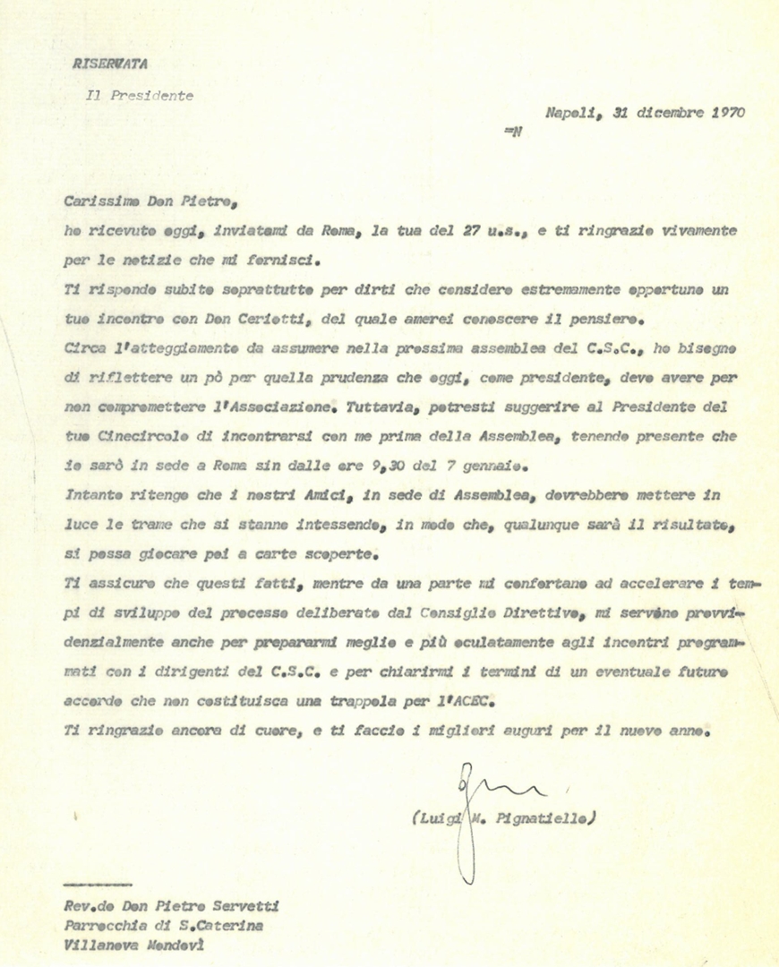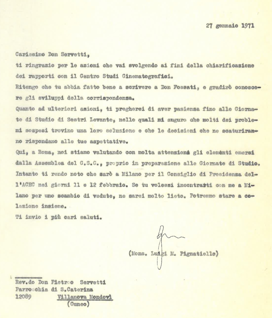 Lettera di mons. Luigi PIgnatiello, presidente dell'ACEC, a don Pietro Servetti della parrocchia di Santa Caterina di Villanova Mondovì