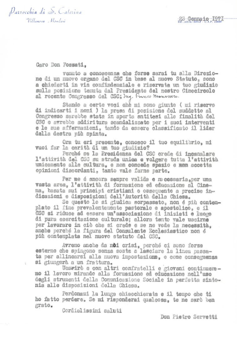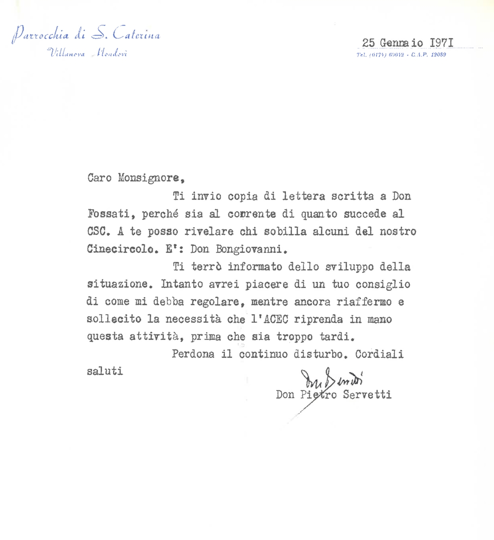 Lettera di don Pietro Servetti della parrocchia di Santa Caterina di Villanova Mondovì a mons. Luigi Pignatiello, presidente dell'ACEC