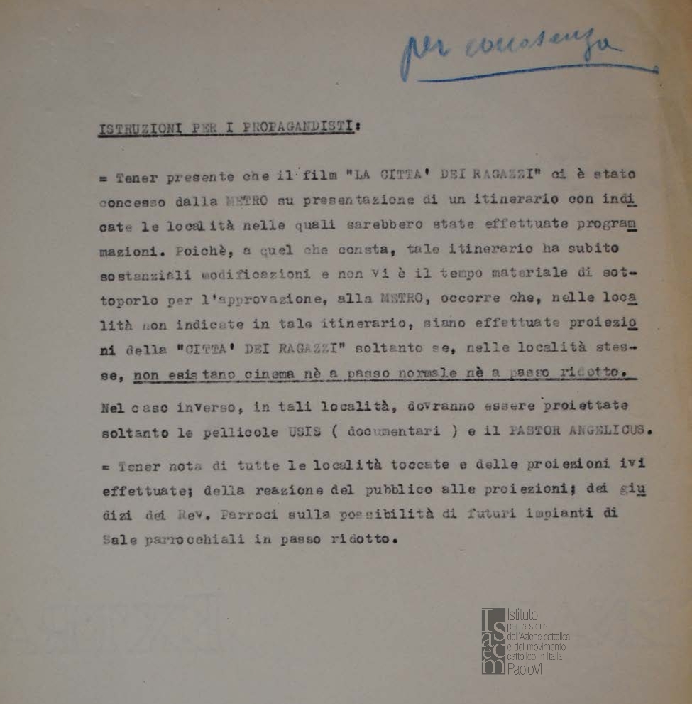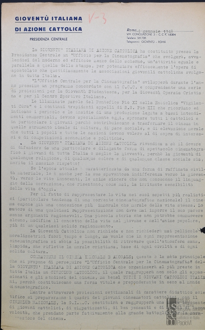 Lettera di Luigi Palma, segretario generale del Centro nazionale di Azione Cattolica di Roma, a Giuseppe Sbodio, del Centro cattolico cinematografico - CCC