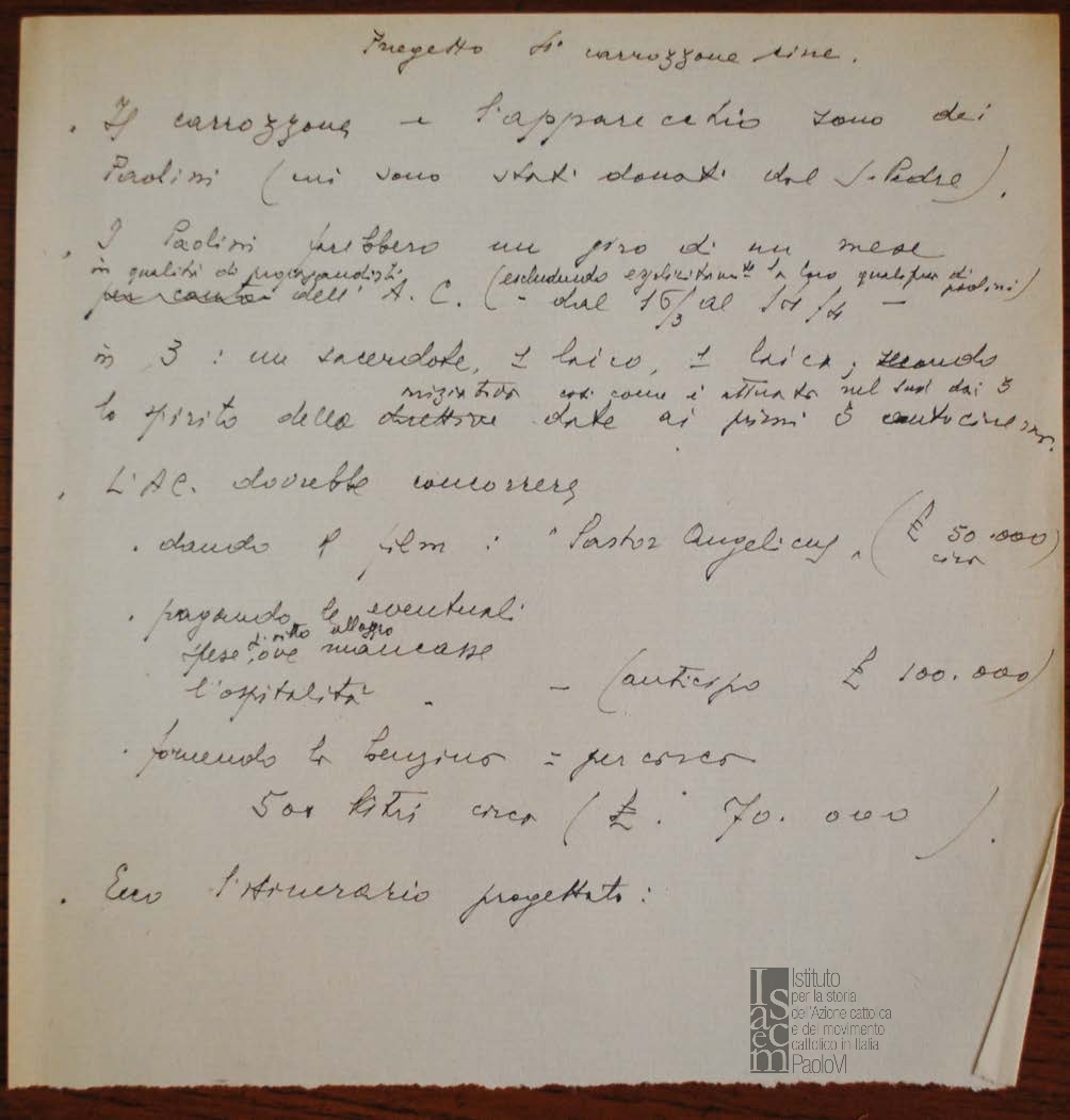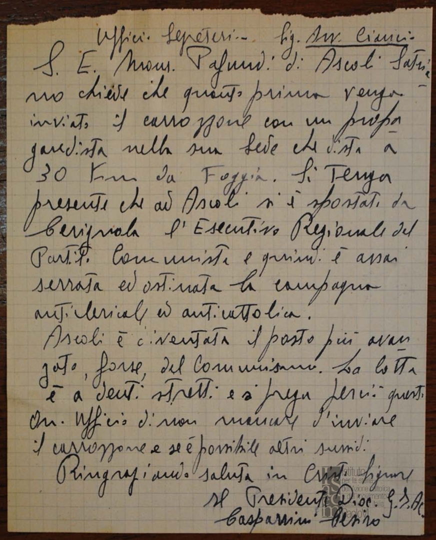 Nota del presidente diocesano [...] di Cerignola (FG) all'avv. Nicola Ciancio, capo segreteria della presidenza generale dell'AC