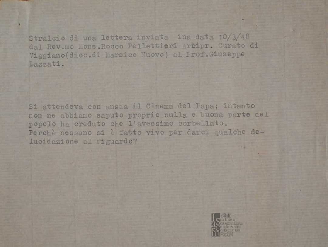 "Stralcio di una lettera inviata in data 10/3/1948 dal Rev. Rocco Pellettieri, aricipr. curato di Viggiano (dioc. di Marsico Nuovo) al prof. Giuseppe Lazzati"