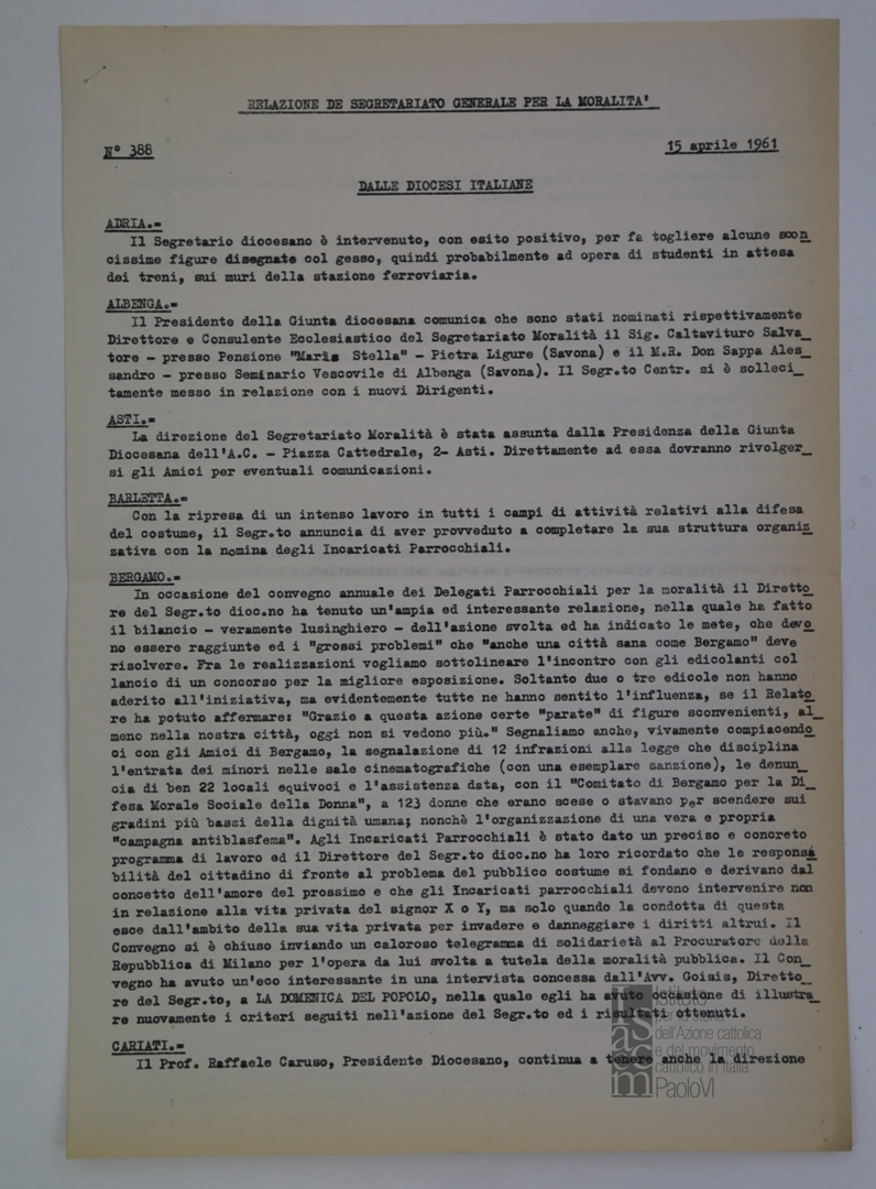 "Relazione del Segretariato Generale per la Moralità. Nr. 388"