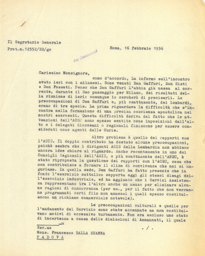Lettera di Floris Luigi Ammannati, vice presidente dell'ACEC, a mons. Grazioso Ceriani, direttore del Centro di orientamento pastorale