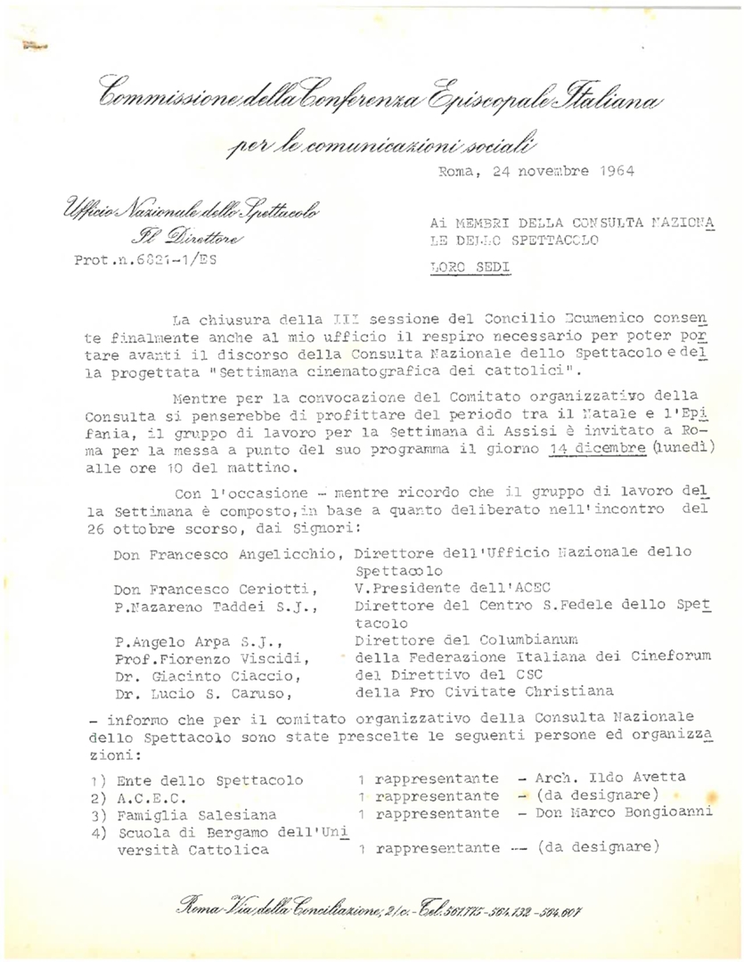 Lettera di mons. Francesco Angelicchio, direttore dell'Ufficio nazionale dello spettacolo, ai membri della Consulta nazionale dello spettacolo