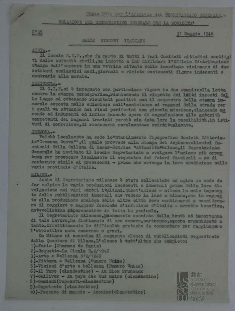 "Relazione del Segretariato Generale per la Moralità. Nr. 35"