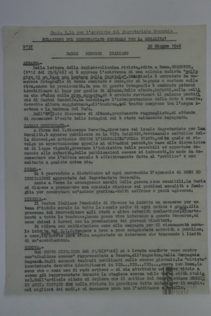 "Relazione del Segretariato Generale per la Moralità. Nr. 37"