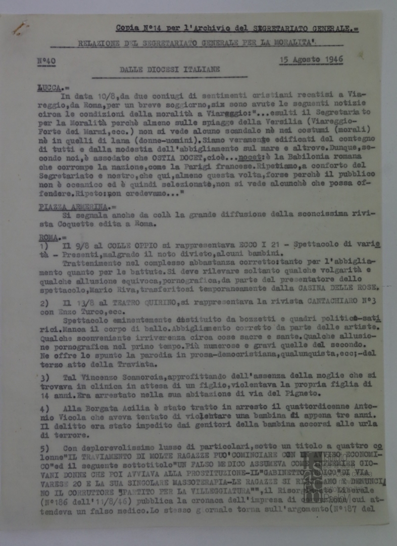 "Relazione del Segretariato Generale per la Moralità. Nr. 40"