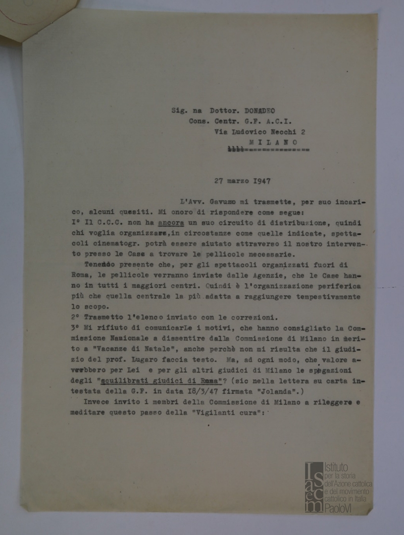 Lettera di Gino Gavuzzo a mons. Ferdinando Prosperini, assistente centrale del Centro cattolico cinematografico - CCC
